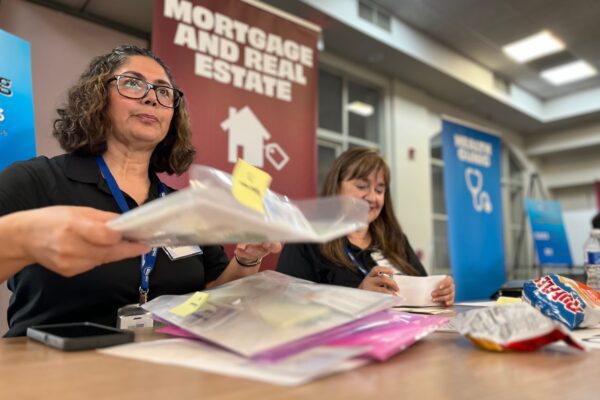 Maria Halbert, 53, hands out paperwork next to Martha Garzon, 58, as part of Interfaith Community Services’ Empathy-Building Experience, a…