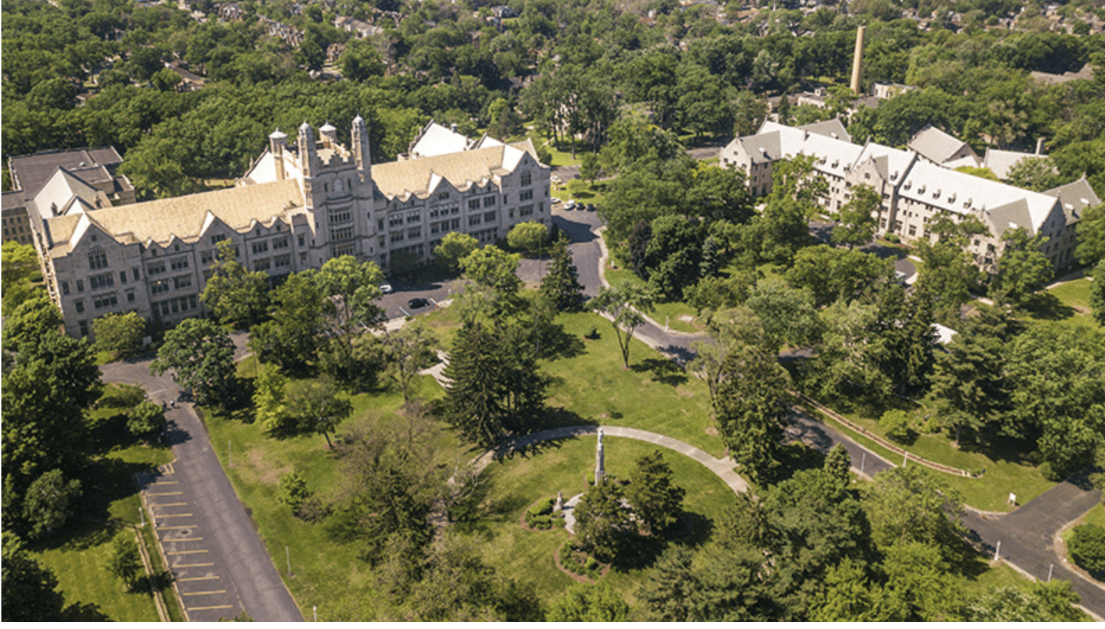 An aerial view of the 53-acre Marygrove College campus focused on two historic Tudor Gothic structures and a large open green space in front of the buildings.